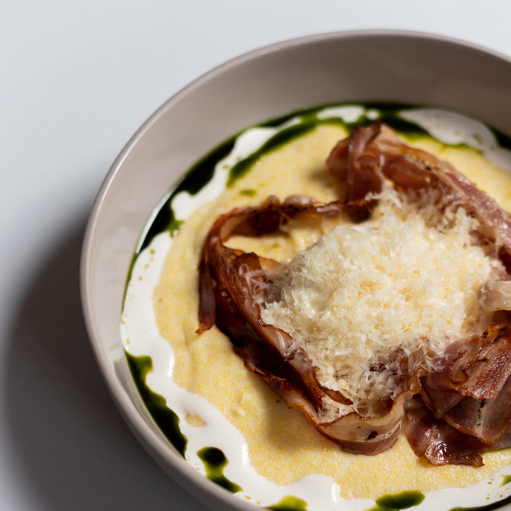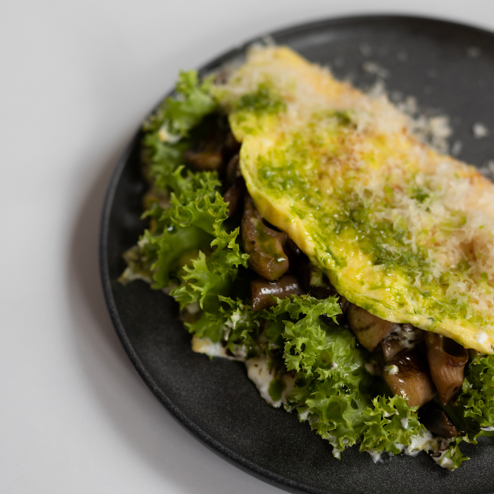 Eggs, cream cheese, truffle paste, parmesan, green oil, champignon, oyster mushrooms