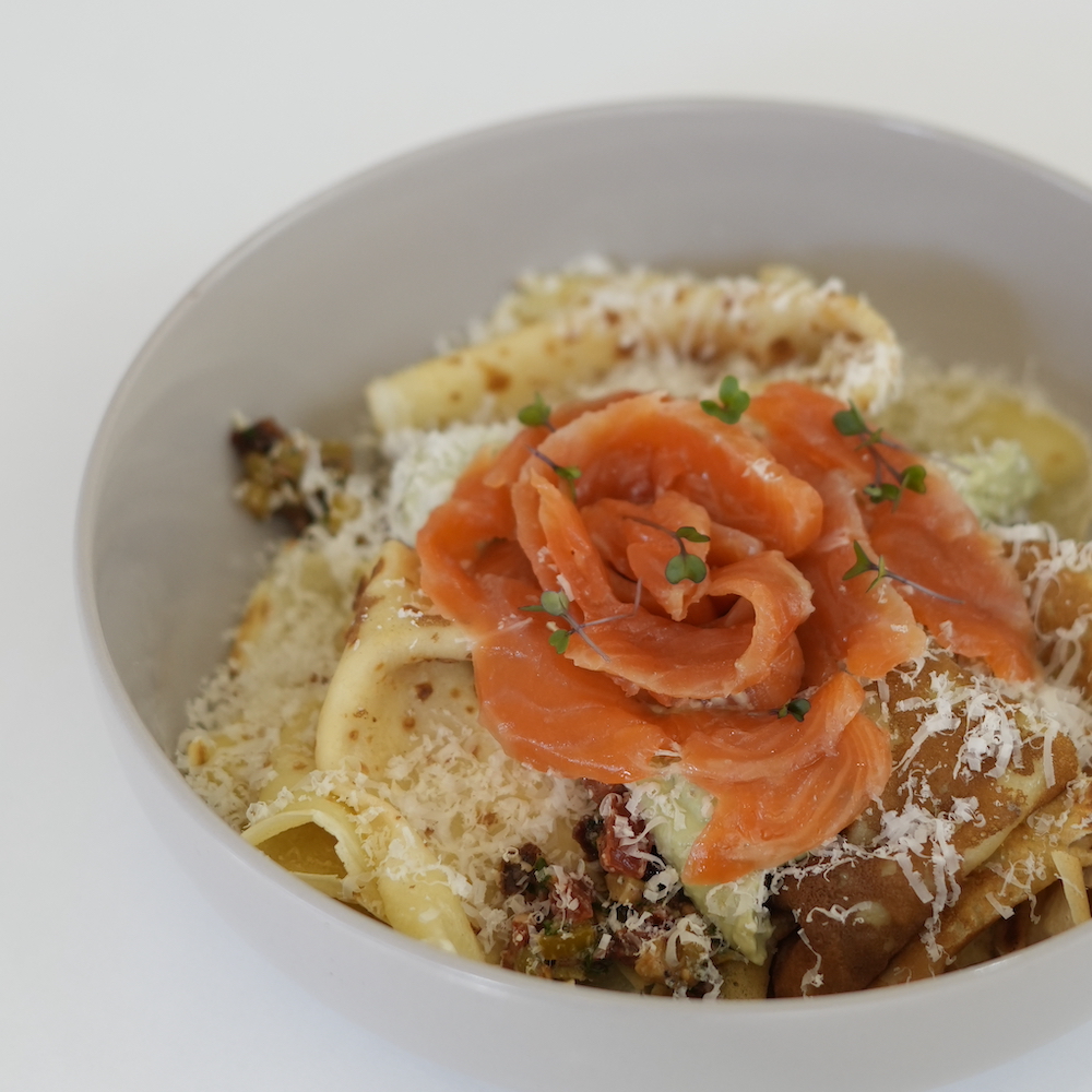 Crepes with parmesan mousse, lightly salted salmon, salsa, avocado mousse