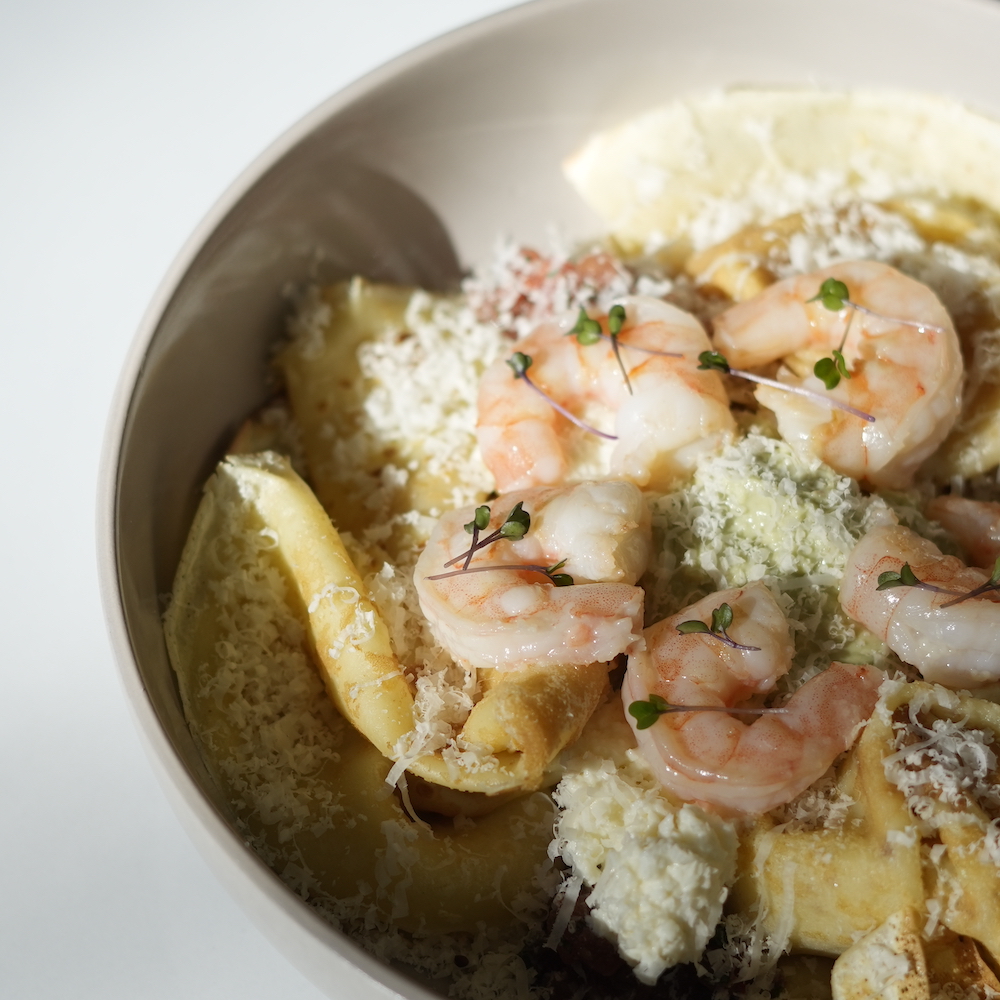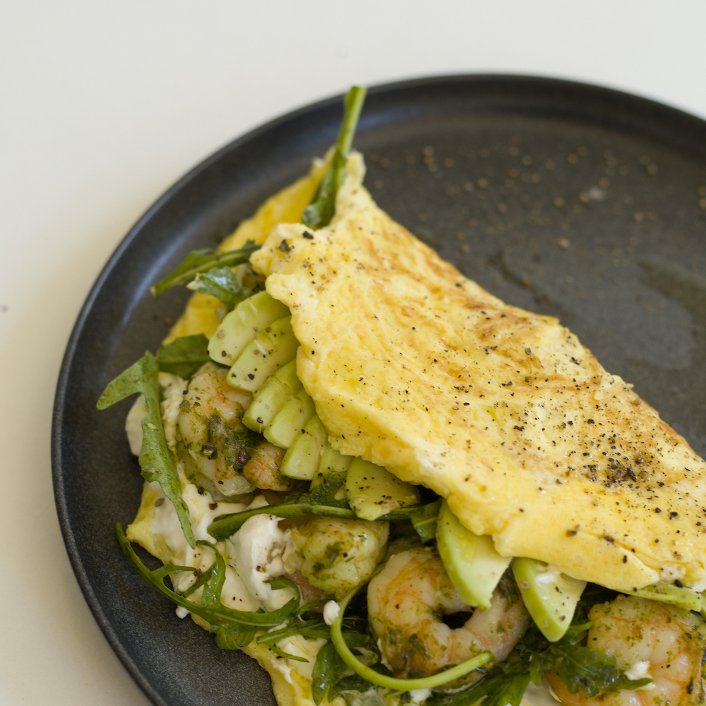 Potato toast, avocado mousse, seasoned tomatoes, pesto, egg, shrimp, parmesan, green butter, mycogreens