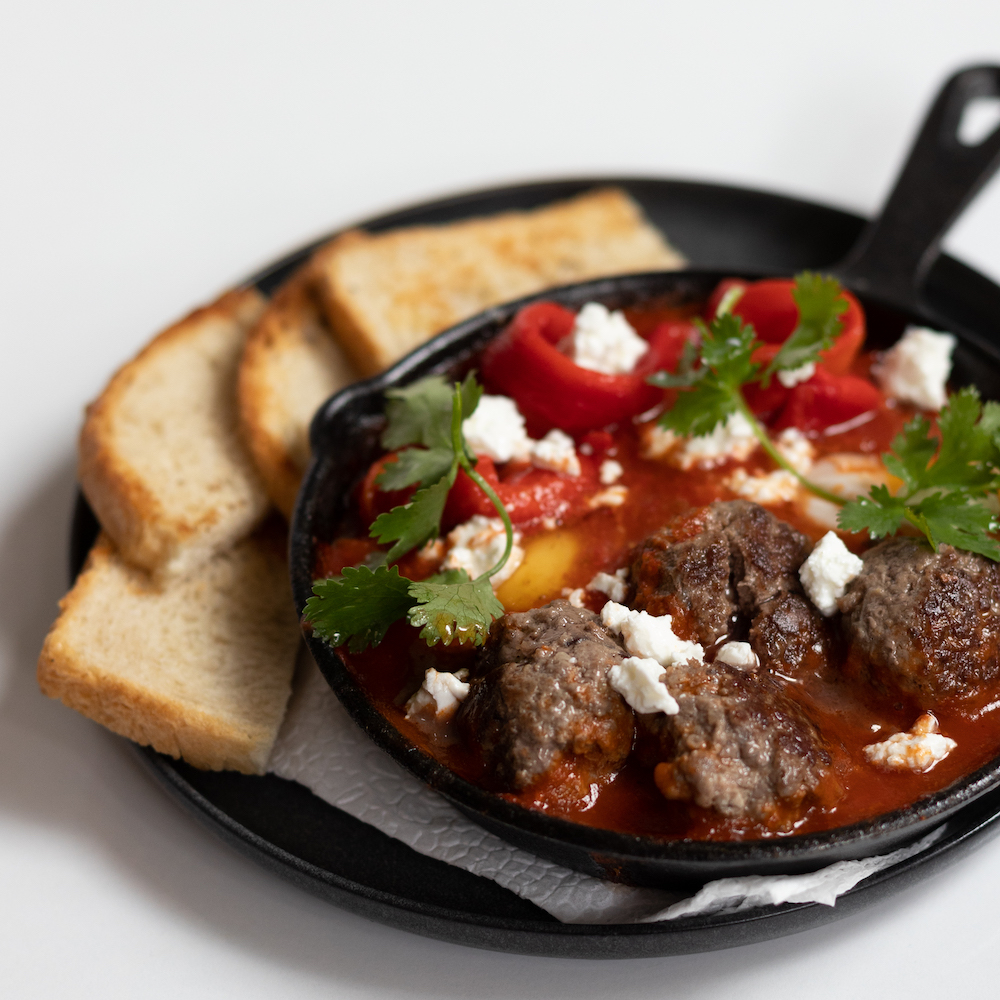 tomatoes, red pepper, feta cheese, beef, toast, eggs